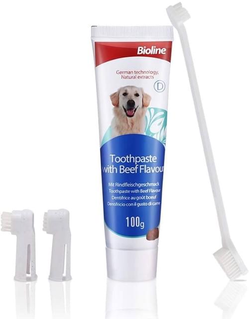 The toothpaste is formulated to be edible and safe for pets, preventing tartar and fighting bad breath.